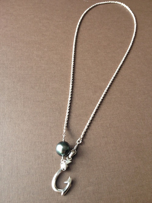 12mm玉のタヒチアンパールとシルバーフィッシュフックのデザインネックレス